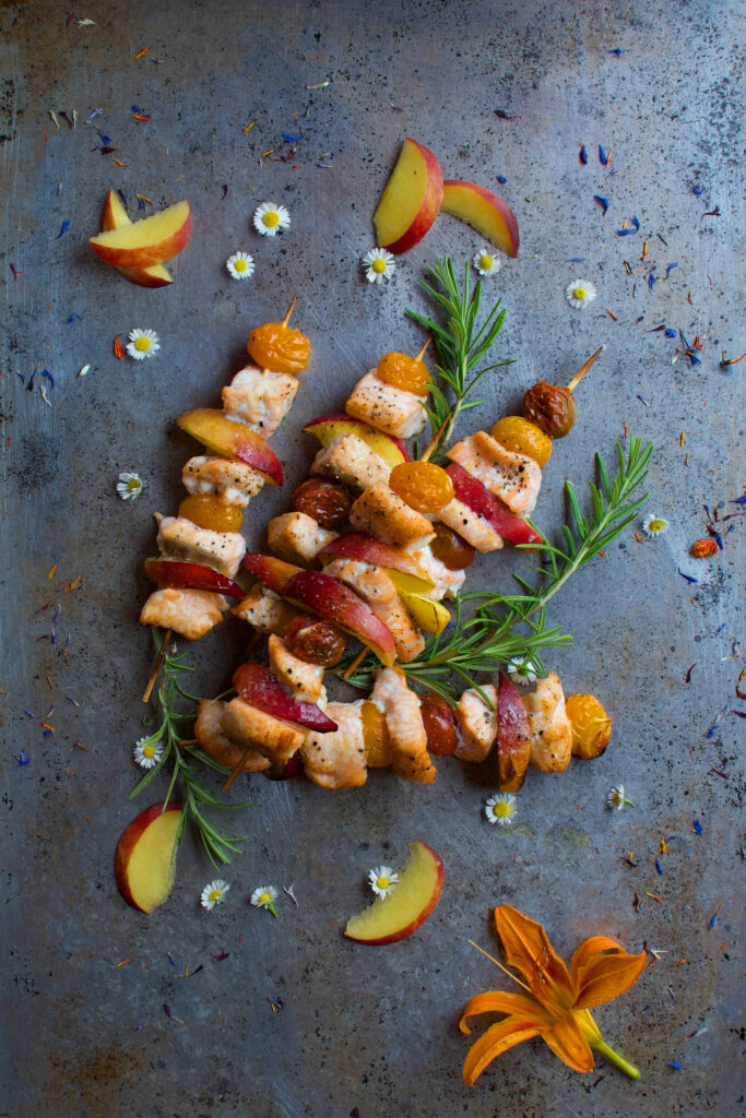 Salmone a cubetti Pesche nettarine Pomodorini ciliegini Sale Pepe nero Olio evo Spiedini di legno