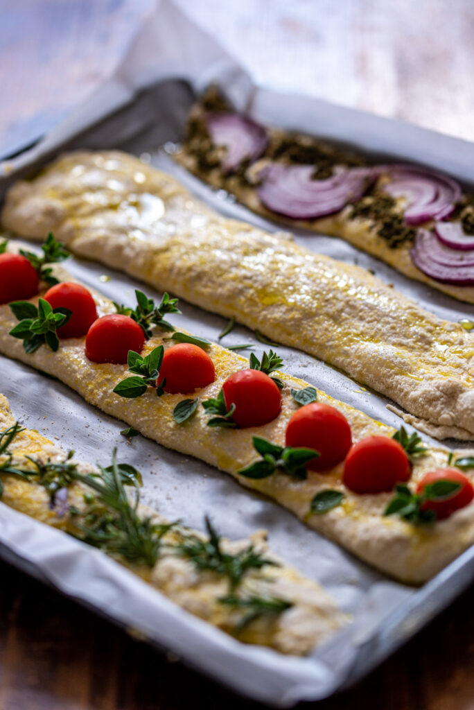 - potete sbizzarrirvi e farcirle con tutto ciò che vi pare, io ne ho fatta una al rosmarino, una con cipolla rossa e za’atar, una con olio e fiocchi di sale e una con pomodorini e origano fresco.