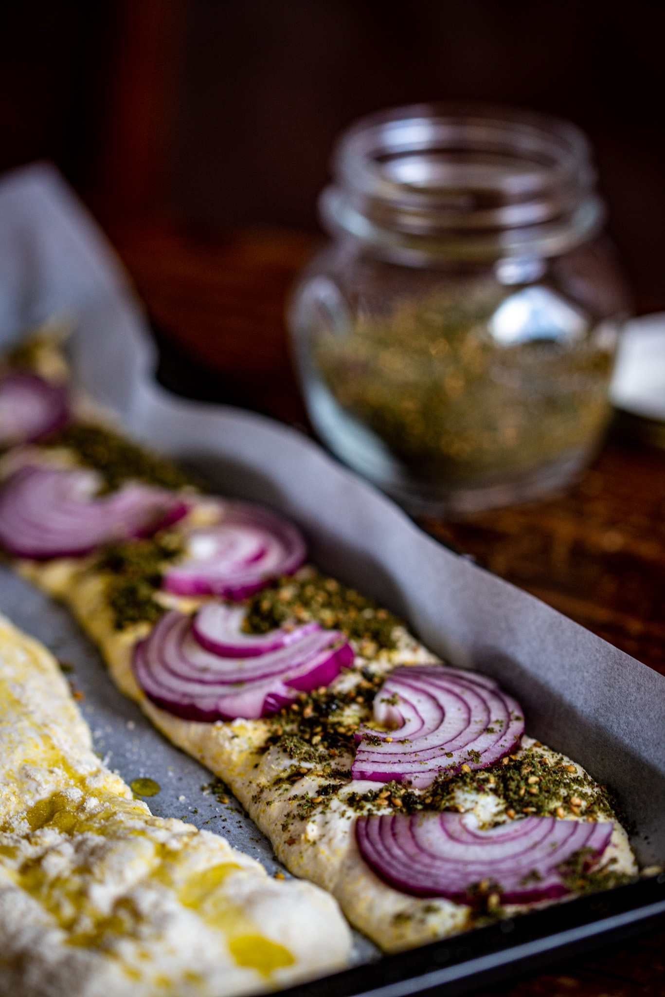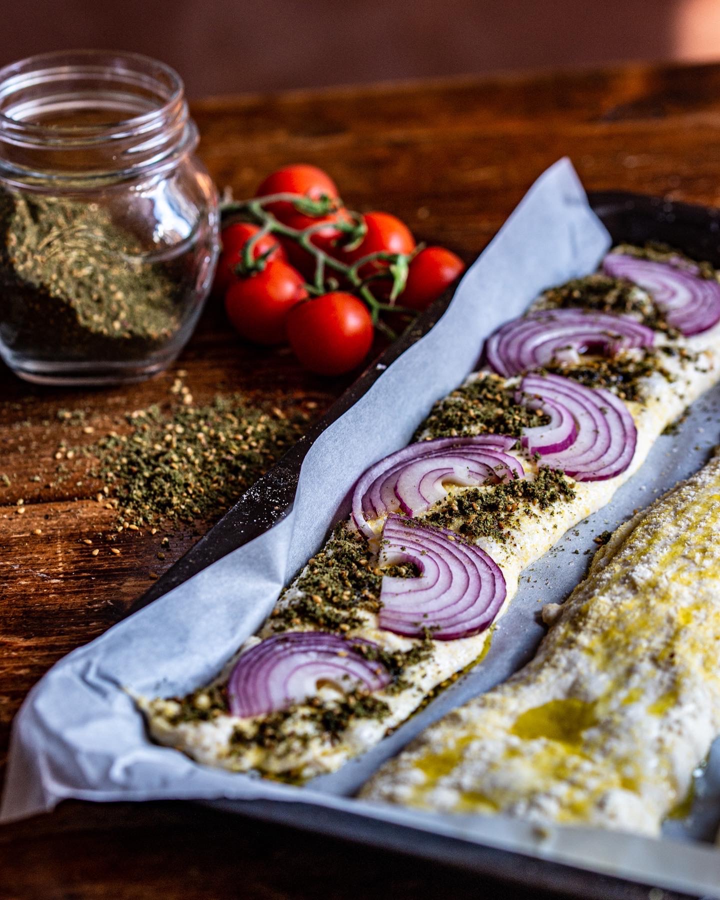 - potete sbizzarrirvi e farcirle con tutto ciò che vi pare, io ne ho fatta una al rosmarino, una con cipolla rossa e za’atar, una con olio e fiocchi di sale e una con pomodorini e origano fresco.