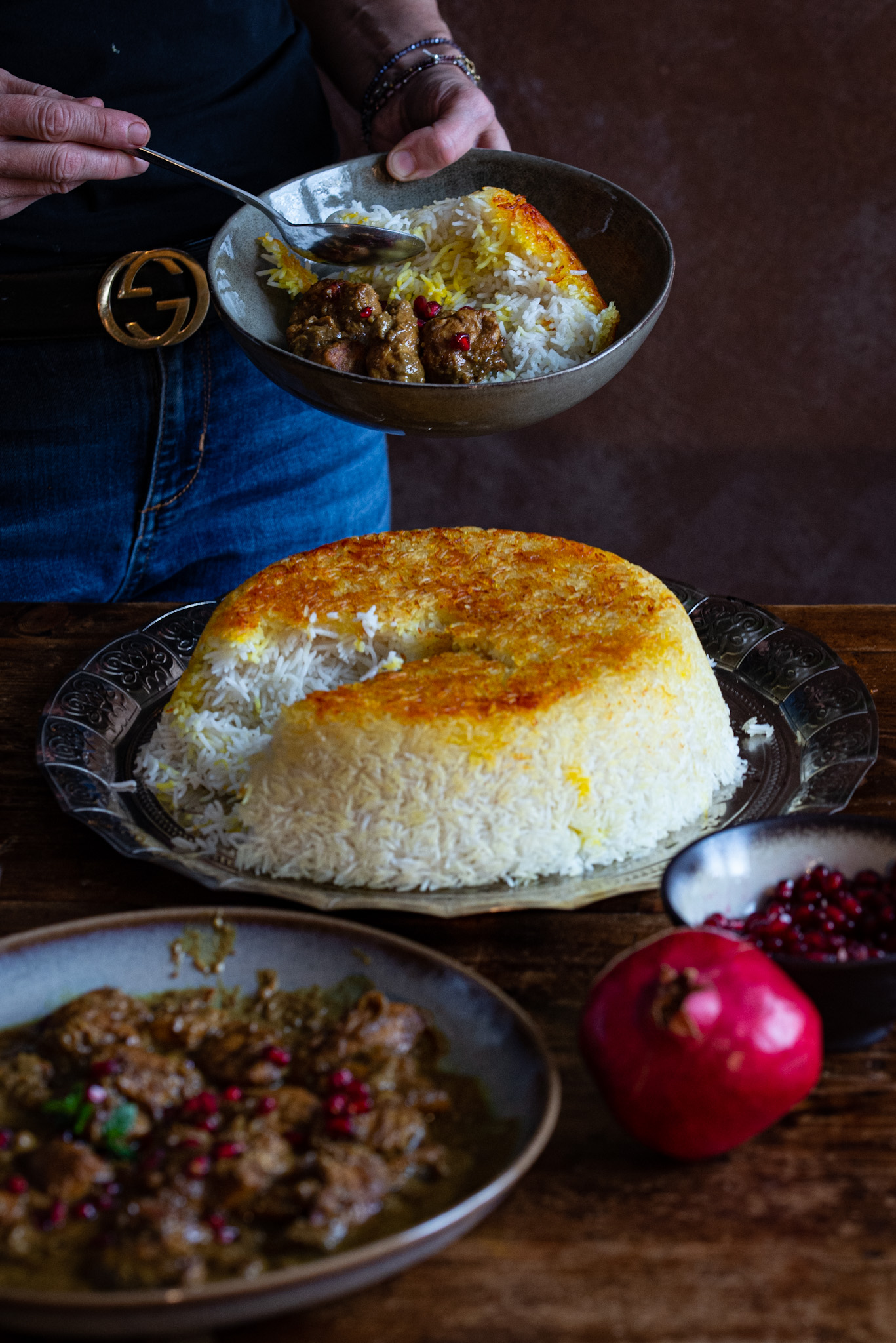 Terminata la cottura il tahdig deve essere capovolto sul piatto per poterlo ammirare in tutta la sua bellezza e gustare con tutti i vostri sensi.