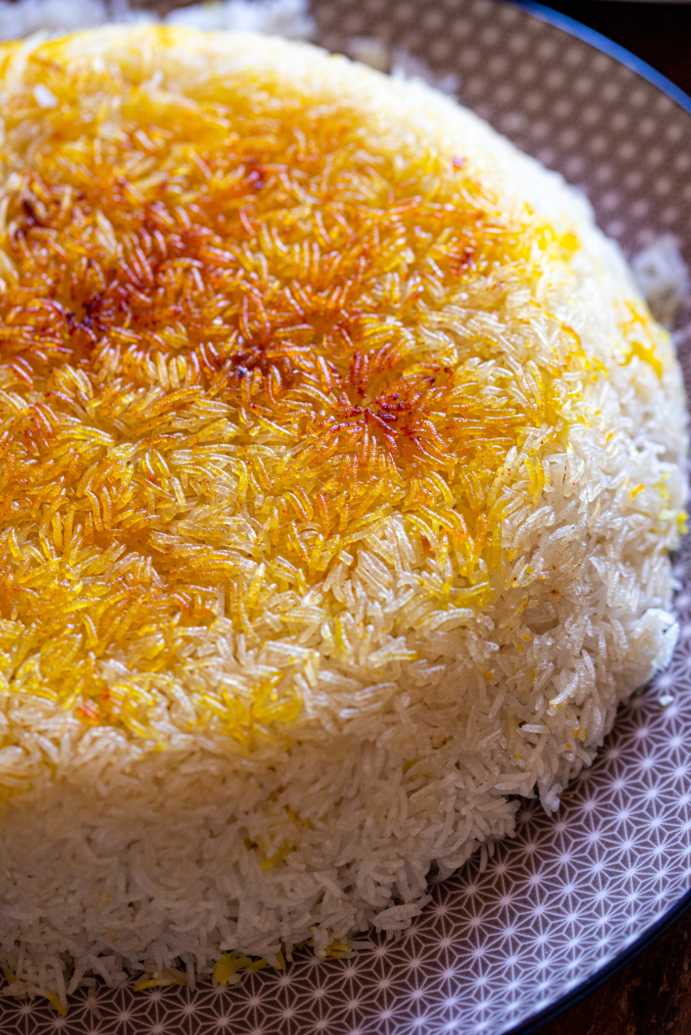 Tahdig nella cucina Persiana si traduce come  “fondo della pentola”ed è un riso perfettamente al dente e sgranato che viene lavato, bollito e cucinato con pazienza in una pentola in cui avrete adagiato olio o burro e zafferano.