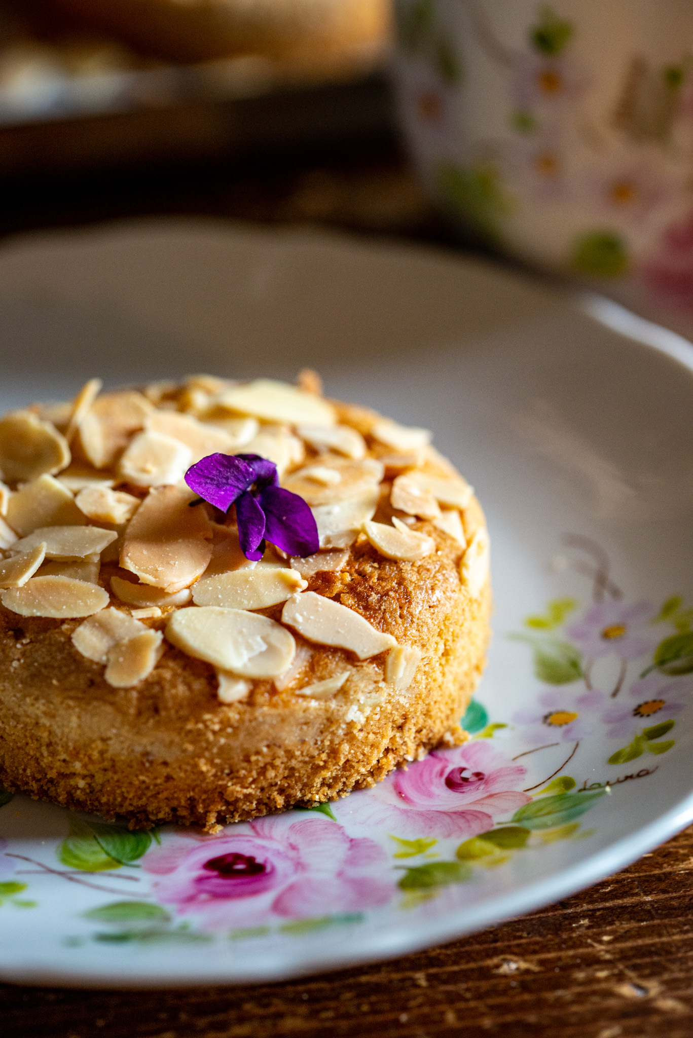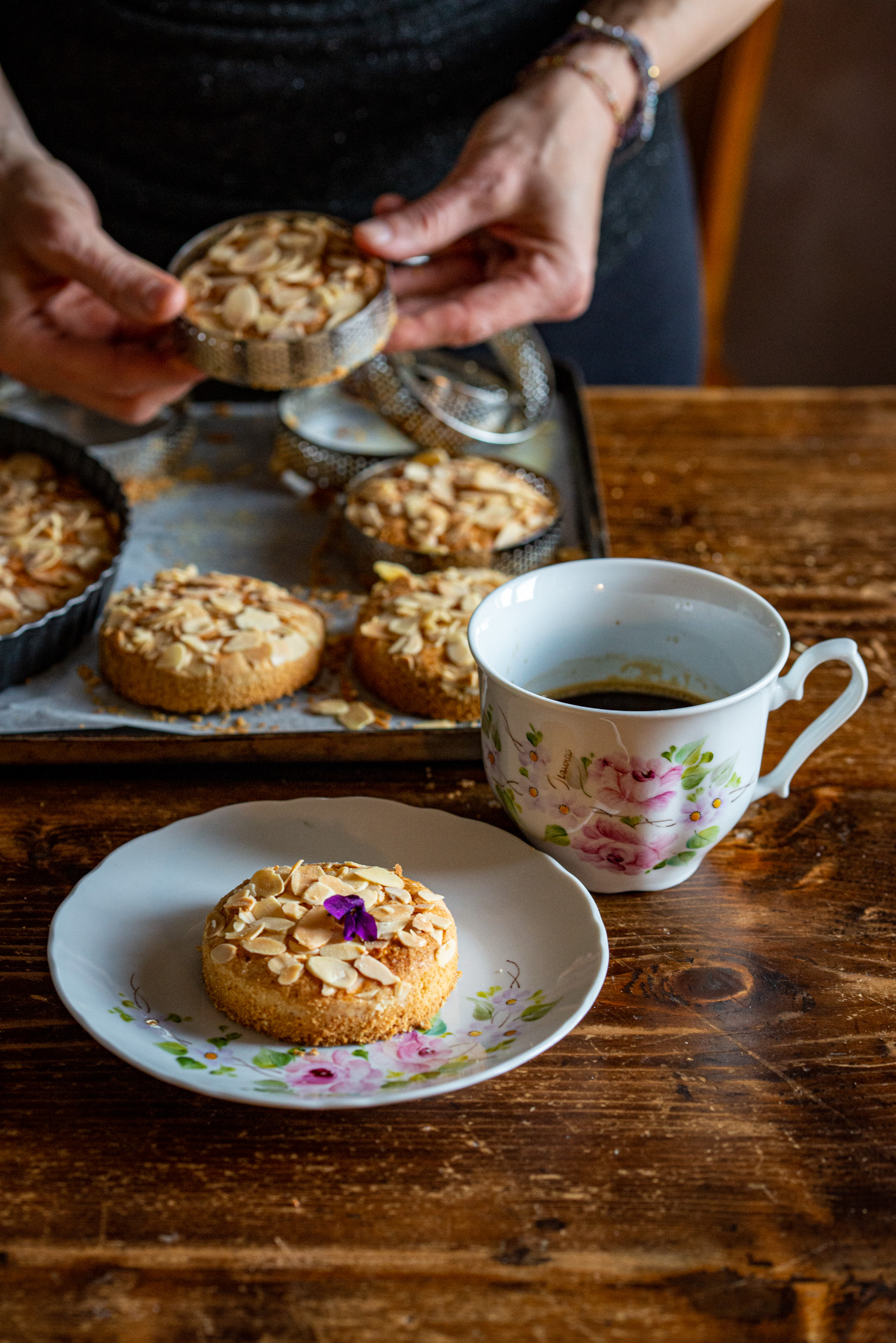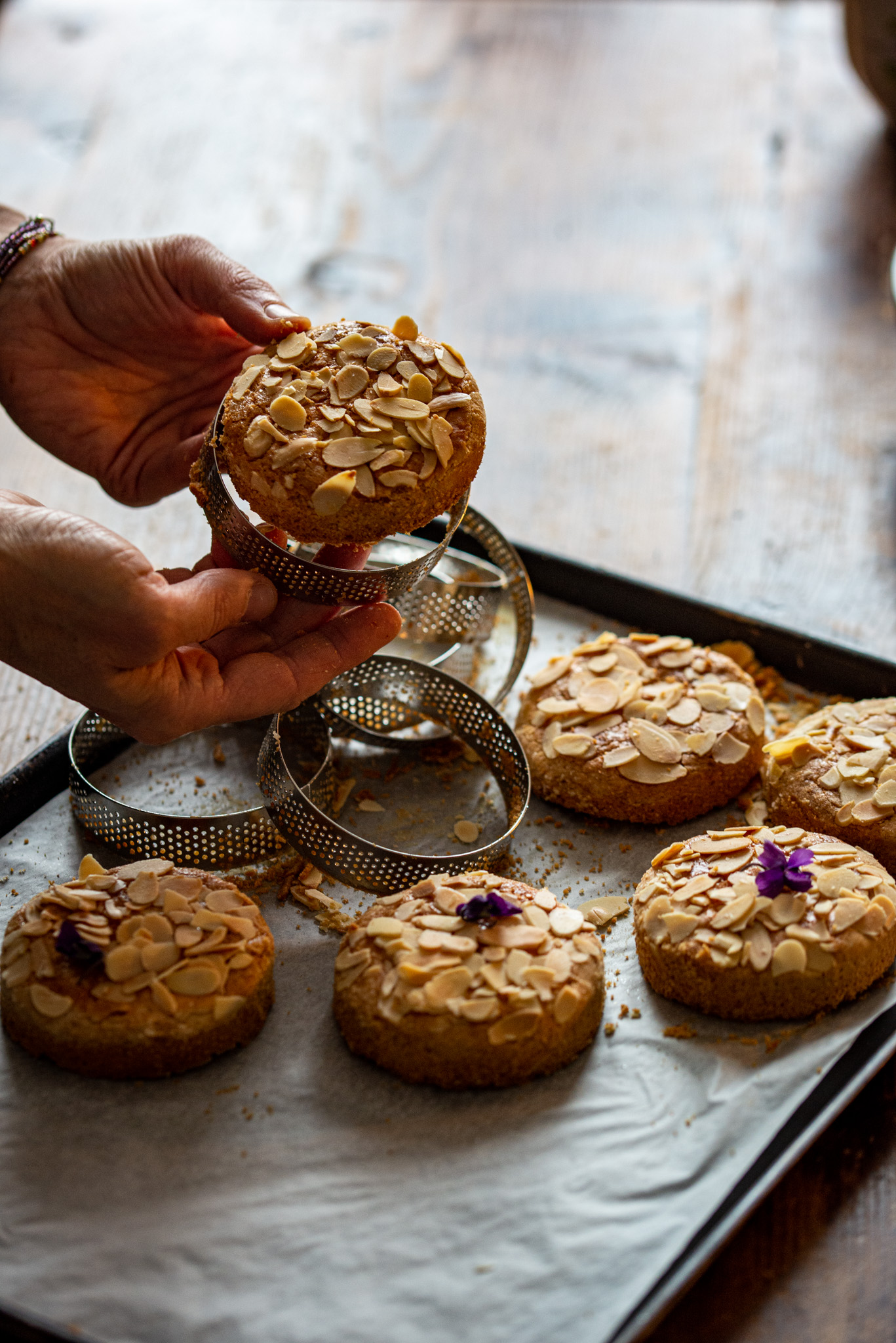 Stendere con un matterello in uno strato di un cm. Con un cerchio coppare la pasta e mettere su una teglia con carta forno. Mantenere l’anello. Sbattere un uovo a parte e con un pennellino lucidare la superficie. Cospargere di zucchero semolato la parte superiore della torta e distribuire le mandorle a lamelle. Infornare a 170° per 35 minuti.