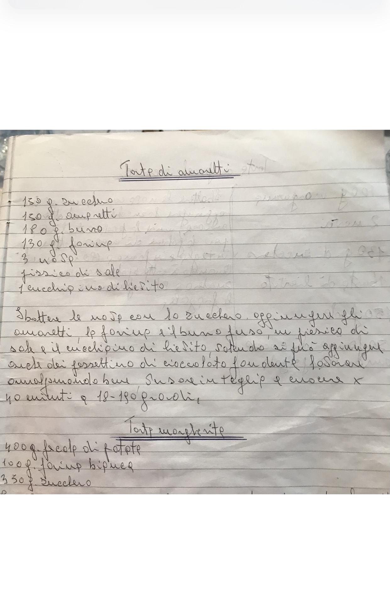 Io sono la più giovane. Il fondatore del gruppo, nonché reclutatore dei partecipanti, di anni ne ha 82. Adriano. Un mito, riesce addirittura a parlare mentre corre. Inutile dire che siamo amici anche senza la tuta da corsa. Attendiamo l’estate per il pranzo annuale nella casa di montagna di Adriano. Cucina sua moglie, la signora Giovanna, che è una cuoca eccellente. E generosa perché ha condiviso con me la ricetta della sua deliziosa torta agli amaretti. È un dolce semplice dalla consistenza un po’ rustica e un gusto che supera le aspettative. Provatela, è perfetta sulla tavola della colazione insieme ad un buon caffè fumante. Vi riporto la ricetta così come l’ho fotografata sul prezioso ricettario della Signora Giovanna, rigorosamente scritta a mano.