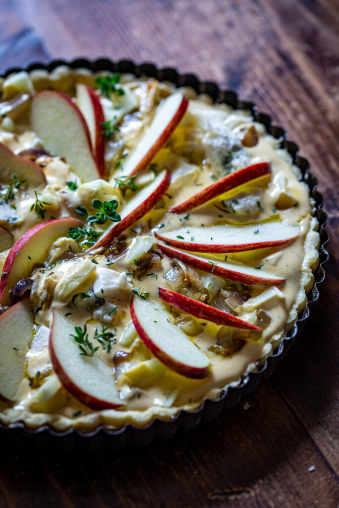In una ciotola versare la panna, i tuorli, il sale, il pepe. Quando il guscio di briseè esce dal forno adagiare l’indivia sul fondo, unire il taleggio tagliato a cubetti, versare il composto di panna e uova e decorare con le mele tagliate a fettine sottili disposte a raggiera. Ultimare con le foglioline di timo.