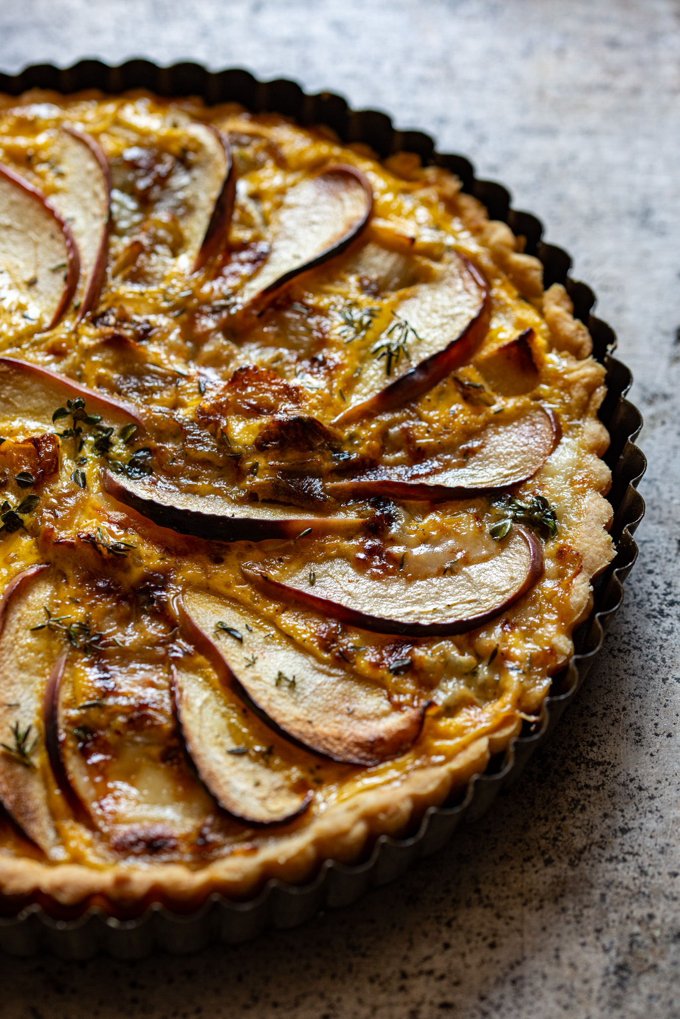 In una ciotola versare la panna, i tuorli, il sale, il pepe. Quando il guscio di briseè esce dal forno adagiare l’indivia sul fondo, unire il taleggio tagliato a cubetti, versare il composto di panna e uova e decorare con le mele tagliate a fettine sottili disposte a raggiera. Ultimare con le foglioline di timo.