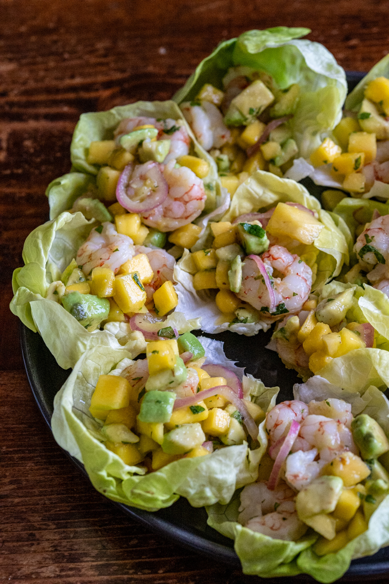 Prepariamo una salsa con il succo di un lime, un cucchiaio di salsa di pesce e due cucchiaini di zucchero di canna dove metteremo per circa 10 min in infusione una cipolla rossa. Aggiungiamo la menta fresca, tritata. Olio extravergine di oliva, sale e pepe. Mescoliamo tutto, con delicatezza. Sarebbe perfetta cosi ma se vuoi servirla su un buffet allora l’idea giusta è quella di adagiarne un cucchiaio su foglie di lattuga croccante che faranno da base avvolgendo l’insalata di gamberi come un involtino delicato.