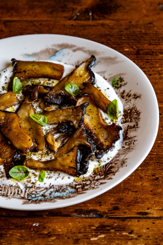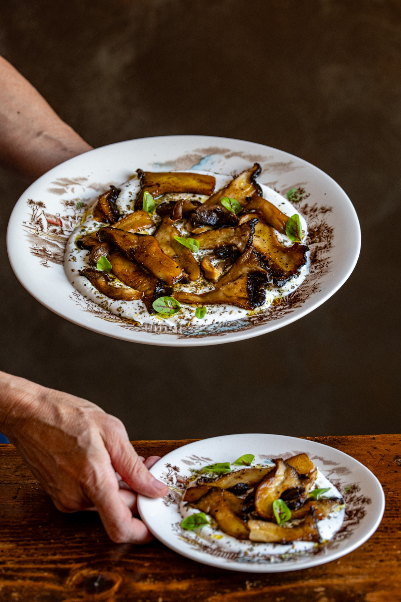 Versare la cagliata su un piatto da portata e cospargere generosamente con metà dello za’atar. Completare con il funghi, condire con il sughetto rimasto nella padella, quindi cospargere con lo za’atar rimanente.
